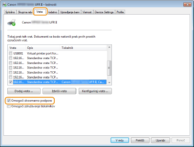 Če uporabljate omrežno povezavo in ste spremenili naslov IP napraveČe je [Opis] za izbrana vrata [Vrata Canon MFNP] in sta naprava ter računalnik v istem podomrežju, se povezava ohrani. Ni vam treba dodati novih vrat. Če so [Standardna vrata TCP/IP], morate dodati nova vrata. Konfiguriranje vrat tiskalnika