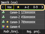 Pogosto uporabljene prejemnike za faksiranje/skeniranje lahko registrirate v imenik in jih nato hitro izbirate, ko jih potrebujete. Prejemnike lahko iščete po abecednem vrstnem redu, po seznamih v imeniku ali z vnosom trimestne številke (številke za kodno izbiranje). Prejemnike lahko hitreje vnašate tudi s spodnjimi funkcijami.