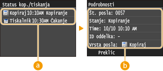 ![]() <Status kop./tiskanja>Prikaže seznam dokumentov, ki se kopirajo, obdelujejo ali čakajo na obdelavo.