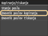 Če je možnost <Prikaz dnevnika poslov> nastavljena na <Izključeno>, ne morete preveriti dnevnika kopirnih opravil. Prikaz dnevnika poslov