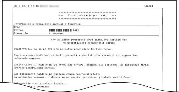 <Meni> <Izpis poročila> <Izpis seznama> <Poročilo o stanju potrošnega materiala> Preverite, ali je v napravo naložen papir ustrezne velikosti in vrste, ki je prikazan na zaslonu <OK> <Da>