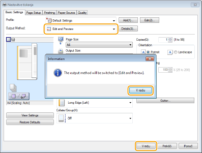 Izberite [Edit and Preview] (Urejanje in predogled) v [Output Method] (Izhodni način).