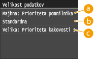 Pri pretvarjanju skeniranih dokumentov v obliko zapisa JPEG lahko določite razmerje stiskanja datotek. Možnost <Majhna: Prioriteta pomnilnika> zagotavlja višje razmerje stiskanja in ustvari manjše datoteke z nižjo kakovostjo slike. Po drugi strani pa možnost <Velika: Prioriteta kakovosti slike> zagotavlja nižje razmerje stiskanja in ustvari večje datoteke z višjo kakovostjo slike.
