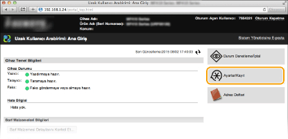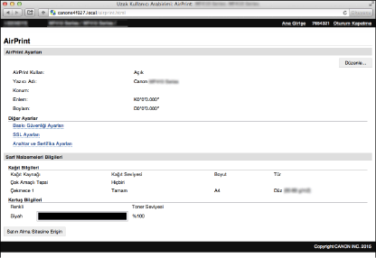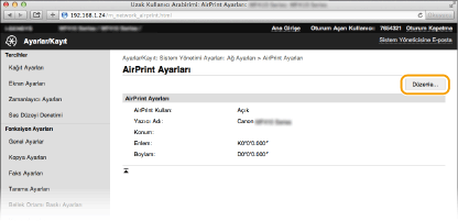 Makinenin adı ve kurulum yeri de dahil olmak üzere, makineyi tanımlamak için kullanılan bilgileri kaydedebilirsiniz. Makinenin AirPrint işlevini devre dışı da bırakabilirsiniz. Bu ayarları değiştirmek için Uzak Kullanıcı Arabirimi'ni kullanın.