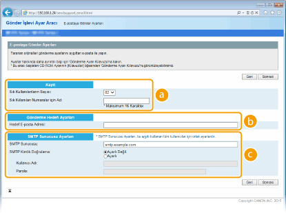 Gönder İşlevi Ayar Aracı e-posta göndermek için temel ayarları yapılandırmanıza yardımcı olur. Gönderme işlemi öncesi POP kimlik doğrulaması veya şifrelenmiş iletişim ayarları gibi daha detaylı ayarları yapılandırmak için Gönder İşlevi Ayar Aracı yerine Uzak Kullanıcı Arabirimini kullanabilirsiniz. E-Posta/I-Faks İletişim Ayarlarını Yapılandırma