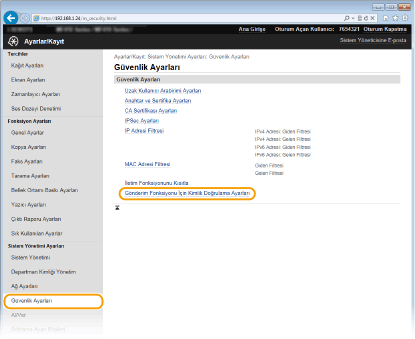 [Güvenlik Ayarları]  [Gönderim Fonksiyonu İçin Kimlik Doğrulama Ayarları] öğesini tıklatın.