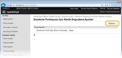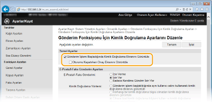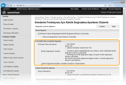 [E-Posta/I-Faks Gönderimi] öğesinde [İzin Ver] veya [Sadece Kendime Göndrm İzin Ver] seçildiğinde, bir e-posta gönderildiğinde SMTP sunucusunda kimlik doğrulama ekranının gösterilip gösterilmeyeceğini belirtebilirsiniz.