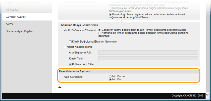 [Dosya Gönderimi] öğesinde [Sadece Kendime veya Belirlenen Klasöre Gönderime İzin Ver] belirtildiğinde