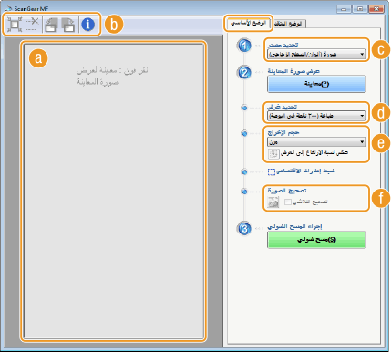 على الشاشة، ثم انقر فوق [مسح ضوئي]. وعند القيام بذلك، يمكنك تكوين الإعدادات الأساسية وإجراء المسح الضوئي.