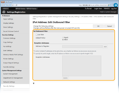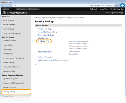 إذا تم إدخال عناوين IP بشكل غير صحيح، قد لا تتمكن من الوصول إلى الجهاز من واجهة المستخدم عن بعد Remote UI، في هذه الحالة تحتاج إلى ضبط <عامل تصفية عنوان IPv4> أو <عامل تصفية عنوان IPv6> على <إيقاف>.