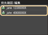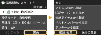 / をタップすると、宛先が順次表示されます。 を押すと、そのとき表示されている相手先を宛先から外すことができます。 |