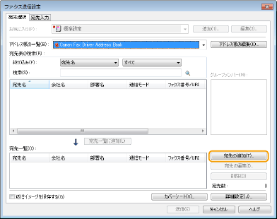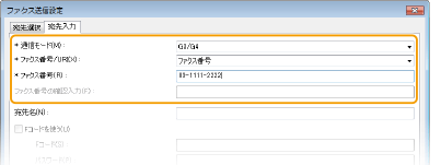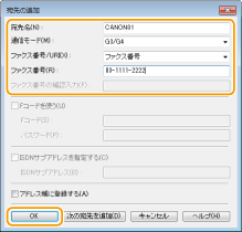 通信モードやファクス番号(またはURI)を設定し、[OK]をクリックする