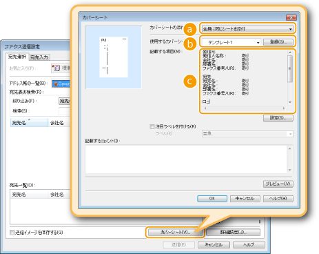 送信原稿にカバーシートを付けることができます。カバーシートはすでに用意されている3つの中から選びますが、自分で作成したカバーシートを付けることもできます。詳細については、ファクスドライバー画面の[ヘルプ]をクリックして、ヘルプを参照してください。