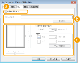 カバーシートにロゴまたは署名を付ける場合は、[ロゴを付ける]または[署名を付ける]にチェックマークを付けます。あらかじめロゴや署名として使うビットマップ形式のデータを用意しておく必要があります。