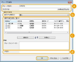 「大阪支店」、「営業1部」のようにグループ名を入力します。[フリガナ]を入力しておくと、宛先を指定するときに50音で宛先を絞り込むことができます。[フリガナ]に入力できる文字は、半角文字(カタカナ、英数字、記号)です。