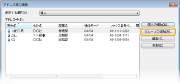 PCファクスで使う宛先をアドレス帳に登録します。登録済みの宛先をいくつか選んで1つのグループとして登録することもできます(グループダイヤル)。グループダイヤルは、複数の宛先にPCファクスするときに便利です。