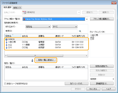 [宛先表の検索]で宛先の絞り込みや検索ができます。
