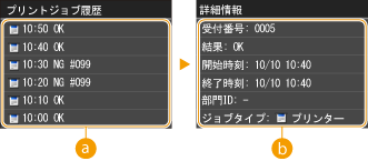 <ジョブ履歴表示のON/OFF>が<OFF>に設定されていると、印刷履歴は確認できません。ジョブ履歴表示のON/OFF