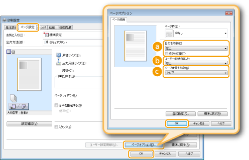日付、ユーザー名、ページ番号の印刷位置を選択