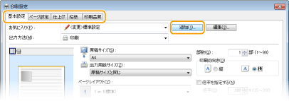 必要に応じて[基本設定]、[ページ設定]、[仕上げ]、[給紙]、[印刷品質]タブから設定を行います。いろいろな印刷設定