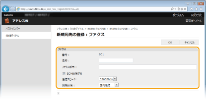 [ECM送信する]および[送信スピード]は、操作パネルの<ファクス設定>( ファクス設定)からも設定できますが、アドレス帳に登録されている宛先は、アドレス帳での設定が有効になります。