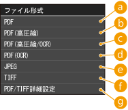 読み込んだ原稿のファイル形式をPDF/JPEG/TIFFの中から選びます。PDFは、データサイズが小さな高圧縮PDFや、OCR(光学式文字認識)でテキスト検索を可能にしたPDF形式を選択できます。