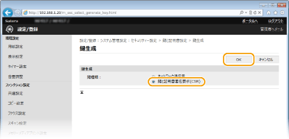 Transport Layer Security(TLS)を使った暗号化通信に必要な鍵ペアを生成できます。TLSは、リモートUIを使って本機にアクセスするときに使用できます。本機に登録できる鍵ペアはプリインストールされている鍵ペアと合わせて最大5つです。「ネットワーク通信用」に生成した鍵ペアでは自己署名証明書が使われます。「鍵と証明書署名要求(CSR)」では、本機で生成した鍵ペアに対して認証局発行の電子証明書を申請することができます。