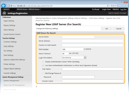 LDAP server registration is separated, with registration either for searching or for authentication. To use an LDAP server for searching for fax and e-mail destinations, register if for searching, and to use it for authenticating sending of e-mail or faxes, register it for authenticating.