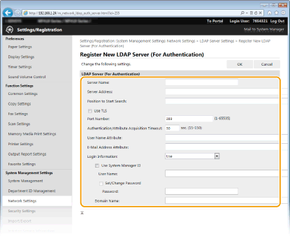 If an LDAP server is implemented in the network, you can search the server for fax numbers or e-mail addresses, and then specify them as destinations or register them in the Address Book. Note also that if send function authentication ( LDAP Server Authentication) is enabled, you must register the server used for authentication. You can register a maximum of five LDAP servers each for searching and for authentication to the machine. Register LDAP servers via the Remote UI.