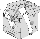 请站在本机正面,抓住提手,然后抬起本机。如果安装了选购输稿器,请将选购输稿器放在地板上,然后在搬动本机的主机后,再搬动选购输稿器。
