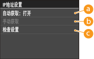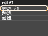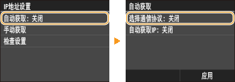 ![]() 如果显示 <打开>,请轻触 <自动获取>,然后将 <选择通信协议> 和 <自动获取IP> 均设置为 <关闭>。