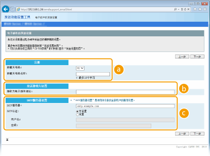 发送功能设置工具有助于配置发送电子邮件的基本设置。除了发送功能设置工具,可使用远程用户界面配置发送前 POP 认证或加密通信的设置等更详细设置。配置电子邮件/I-Fax 通信设置