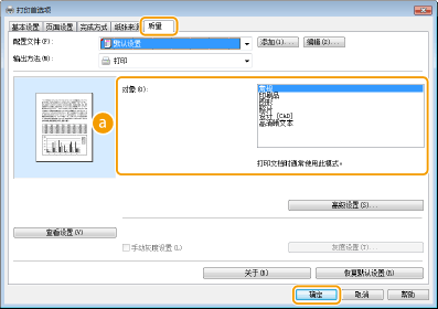 若要为在 [对象:] 中选择的每个项目指定详细设置,请单击 [高级设置]。更多信息,请单击打印机驱动程序画面上的 [帮助]。