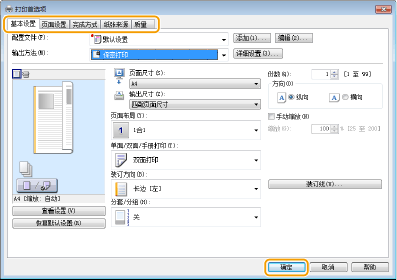 单击 [基本设置]、[页面设置]、[完成方式]、[纸张来源] 或 [质量] 选项卡,根据需要在各画面上指定打印设置。
