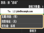 指定多个接收方时,第二个及后面的接收方必须是在地址簿或 LDAP 服务器中注册过的接收方。关于 Cc 和 Bcc,只可指定地址簿中注册过的接收方。要使用地址簿或 LDAP 服务器,必须先完成必需的注册步骤。