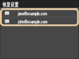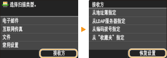 您可以从过去的三个接收方中选择一个接收方。当指定之前使用过的接收方时,本机也可以设置与上次发送文档到该接收方时所使用的相同扫描设置,例如浓度等。