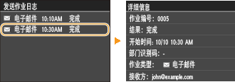 ![]() <发送作业日志>显示已发送文档的列表。文档发送成功时会显示 <完成>,文档发送因取消或出现错误而失败时会显示 <错误>。