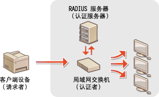 IEEE 802.1X 是通过集中管理用户认证信息来拦截无授权网络访问的标准和机制。如果某一设备试图连接至 802.1X 网络,则该设备必须通过用户认证,才能证明是由授权用户进行连接。认证信息被发送到 RADIUS 服务器并由其检查,视认证结果而定,该服务器允许或拒绝与网络通信。如果认证失败,局域网交换机(或访问点)将阻止从网络外部访问。本机可作为客户端设备连接至 802.1X 网络。