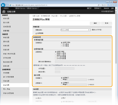 若要启用 ESP 认证,请对哈希算法选择 [SHA1]。如果想要禁用 ESP 认证,请选择 [不使用]。