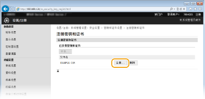 如果密钥对当前用于某种用途,如当 [密钥使用] 下显示“[TLS]”或“[IEEE 802.1X]”时,无法删除该密钥对。在这种情况下,请禁用此功能或更换密钥对,再进行删除。无法删除预装的 CA 证书。