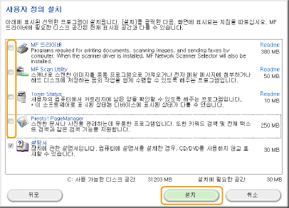 [설명서]를 제외한 모든 확인란의 선택을 해제하고 [설치]를 클릭합니다.