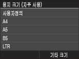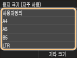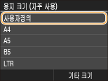 용지 적재 시 위에 나오는 화면이 표시되지 않을 경우다목적 트레이에 항상 동일한 용지를 넣는 경우 용지 크기 및 종류를 기본 설정으로 등록하면 용지 설정 작업을 건너뛸 수 있습니다. 하지만 기본 설정을 등록하면 위와 같은 화면이 표시되지 않습니다. 이 화면을 표시하려면 <용지 세트시 지정>(다목적 트레이에 기본 용지 설정 등록)을 선택하십시오.
