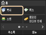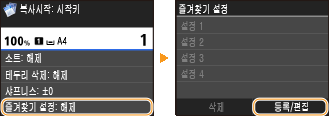 자주 사용하는 복사 설정 조합을 최대 네 개까지 등록할 수 있습니다. 필요한 경우 등록된 설정 조합을 간편하게 선택할 수 있으므로 복사할 때마다 동일한 설정을 구성할 필요가 없습니다. 예를 들어, 자주 사용하는 복사 매수를 5매로 설정하고, <테두리 삭제>를 <설정>으로 지정한 다음, 복사 시 선명도를 높일 수 있습니다. 설정을 홈 화면에 단축 버튼으로 표시할 수도 있습니다.