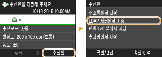 사무실에 LDAP 서버가 설치되어 있을 경우, 서버의 사용자 정보를 사용하여 수신인을 지정할 수 있습니다. 기기를 통해 LDAP 서버에 액세스하여 해당 사용자 정보를 검색하고 이를 수신인으로 지정합니다.