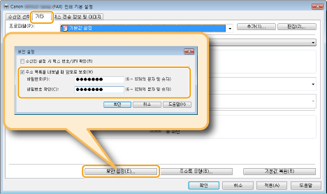 [주소 목록을 내보낼 때 암호로 보호] 를 선택한 경우 [기타] 탭의 [보안 설정] 을 클릭할 때 표시되는 대화 상자에서, [내보내기].를 클릭하면 비밀번호를 입력할 수 있는 대화 상자가 표시됩니다. 자세한 내용을 보려면 팩스 드라이버 화면의 [도움말] 을 클릭하십시오.