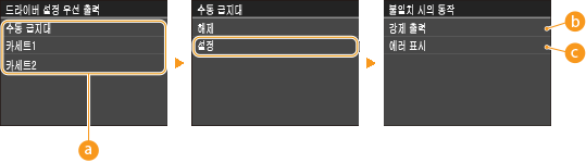 <설정>을 선택한 상태에서 프린터 드라이버의 설정이 적재된 용지의 크기 및 종류와 일치하지 않으면 용지 걸림이나 인쇄 오류가 발생할 수 있습니다.