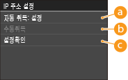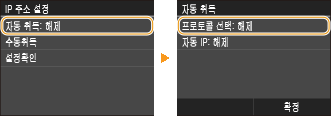 ![]() <설정>이 표시되면, <자동 취득>을 누르고 <프로토콜 선택>과 <자동 IP>를 모두 <해제>로 설정합니다.