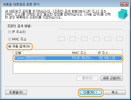 [자동 검색]을 선택하고 기기가 검색되면 선택한 후 [다음]을 클릭합니다.