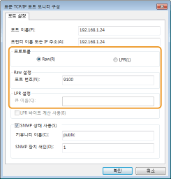 [프로토콜 유형] 에서 [RAW] 또는 [LPR]을 선택하고 [포트 번호]를 변경합니다.