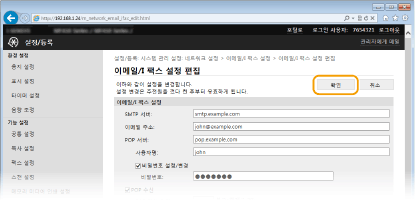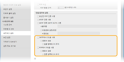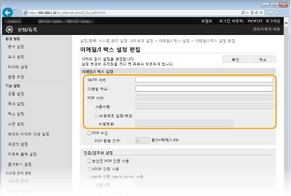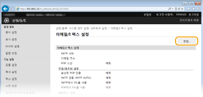 리모트 UI를 사용하여 I-팩스 송수신용 기기 설정 및 이메일 또는 I-팩스 전송 전 POP 인증 및 통신 암호화 설정과 같은 전송 및 수신 상세 설정을 구성합니다. 필요한 설정은 제공업체 또는 네트워크 관리자에게 문의하십시오.